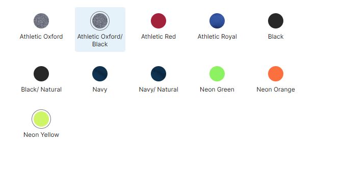 | Color | Athletic Oxford, Athletic Oxford/Black, Athletic Red, Athletic Royal, Black, Black/Natural, Navy, Navy/Natural, Neon Green, Neon Orange, Neon Yellow |