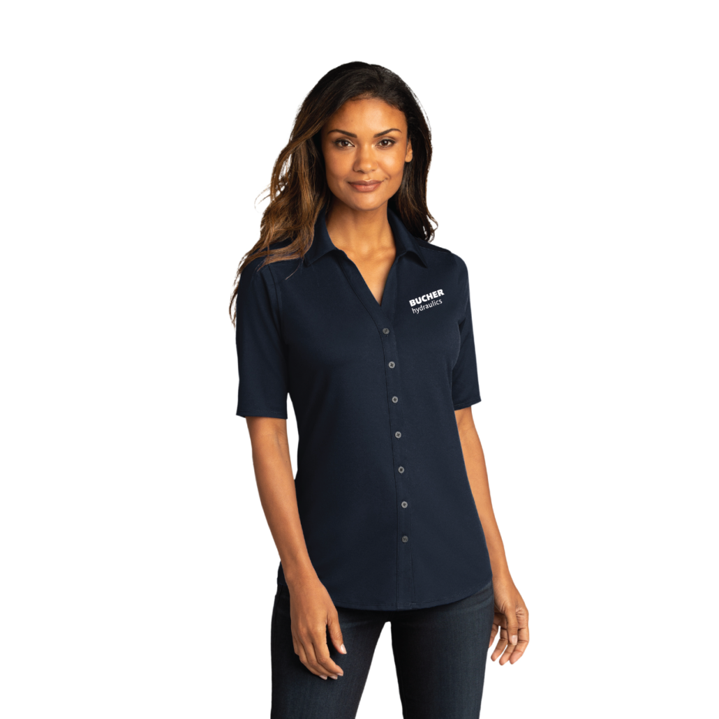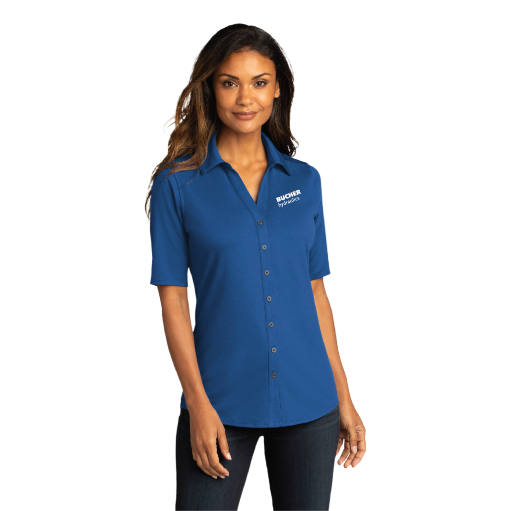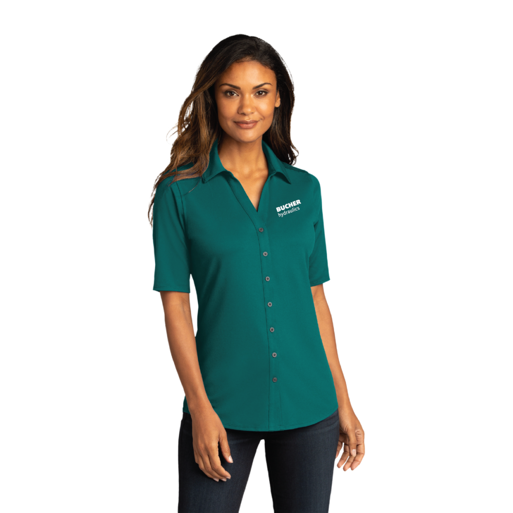 Performance joins professionalism in this Easy Care style that is snag-resistant and wicks moisture while also resisting odors.
